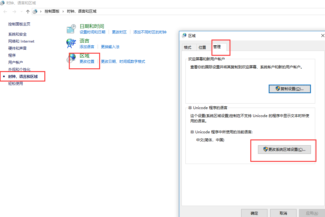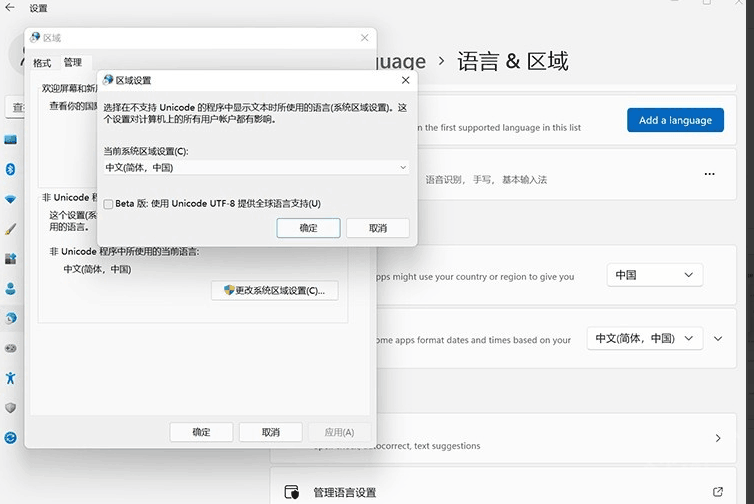 进入电脑的设置 -> 语言设置 -> 语言与区域 ->管理语言设置->更改系统区域设置,把语言时区修改下,然后重启系统。