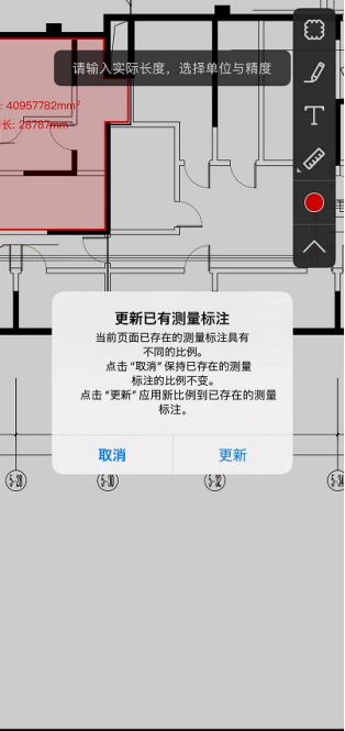 4.如果做了测量后,再次调整比例,会弹窗下面的弹窗,根据自身需求点击“取消”或“更新”。