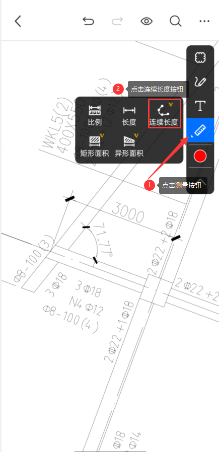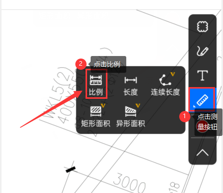 本次更新主要讲了5种测量功能,点击测量测量按钮即可显示:比例,长度,连续长度,矩形面积,异形面积。