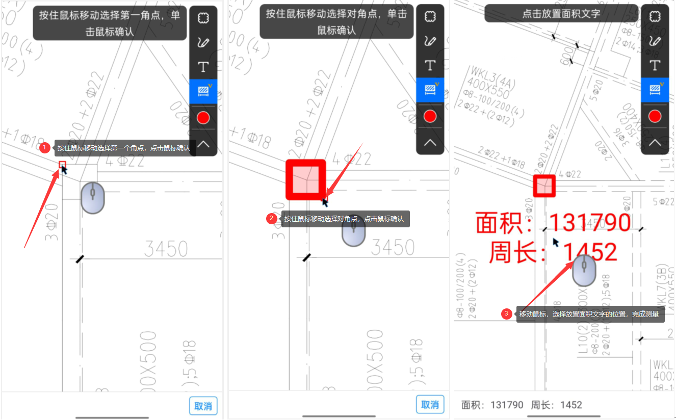 4、矩形面积:通过点击矩形对角线两点测量矩形面积