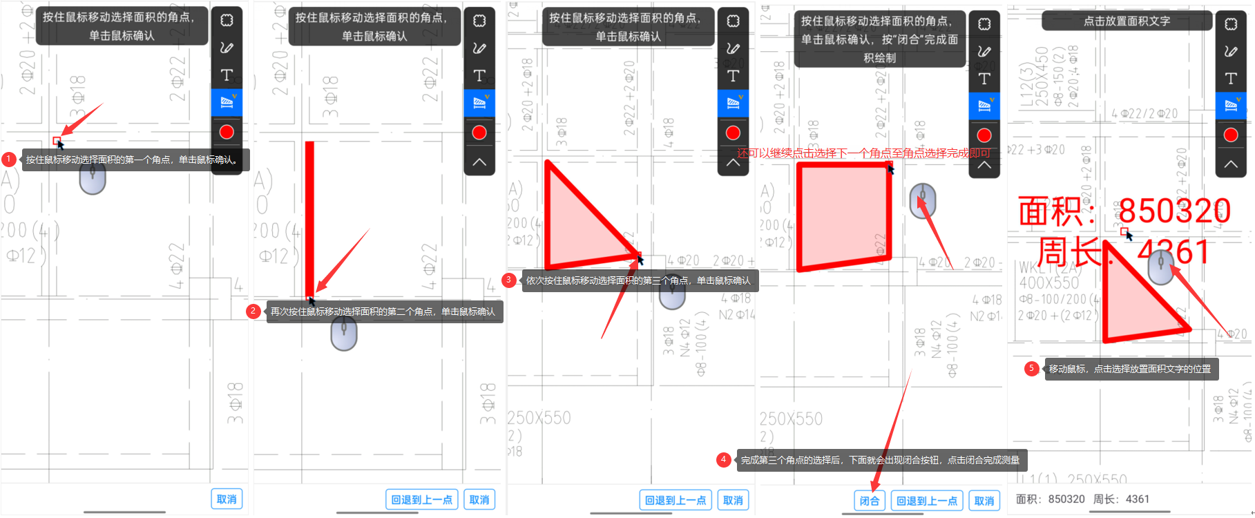 ②按住鼠标移动选择第一个点,点击鼠标确认,然后依次按住鼠标移动选择要测量的点,点击鼠标确认,选择完成后,点击完成按钮,移动鼠标选择放置面积文字的位置,单击鼠标即可完成异形面积的测量。