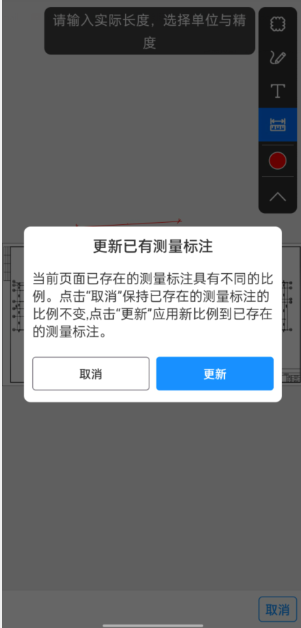 d.做了测量后,再次调整比例,会弹窗下面的弹窗,根据自身需求点击“取消”或“更新”。