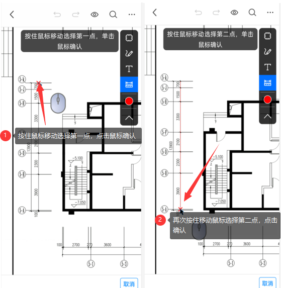 ②按住鼠标移动选择第一个点,点击鼠标确认,然后按住鼠标移动选择第二个点,点击鼠标确认,即可测量出两点之间的距离。