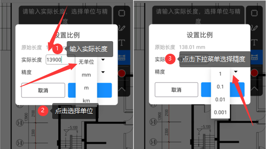 ③点击鼠标确认,在弹出的小窗口里输入实际长度。单位和精度均可自行设置。单位可选择:mm,m和km;精度可以精确到后面三位小数。
