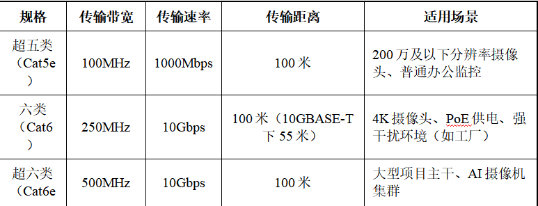 网络摄像机主要用网线传输,同时支持PoE供电(网线既传数据又供电),性价比极高。目前主流是超五类(Cat5e)和六类(Cat6),两者区别很大: