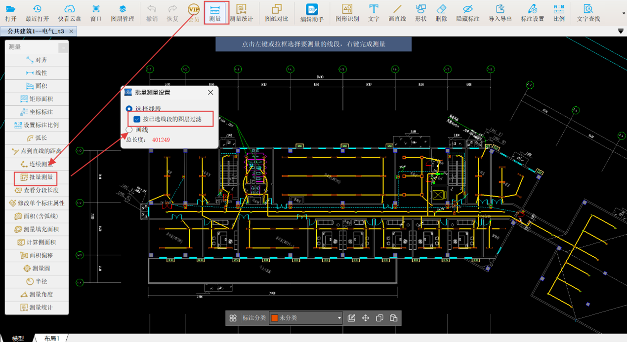 随后依次启用【测量】与【批量测量】功能,勾选【按已选线段的图层过滤】选项后框选二层照明平面图。如图所示,二层照明平面图中照明回路水平配线为401.249×3=1203.747米。