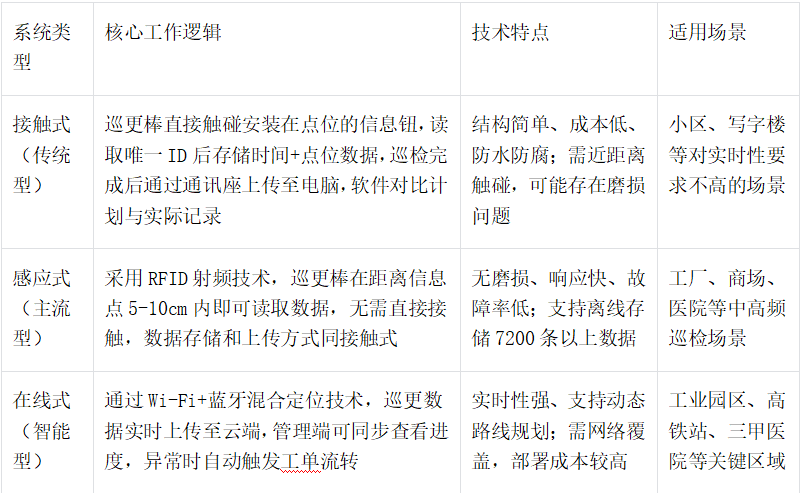 电子巡更系统的核心逻辑是“点位标识+数据记录+智能分析”,不同技术路线的实现方式略有差异,具体对比见下表: