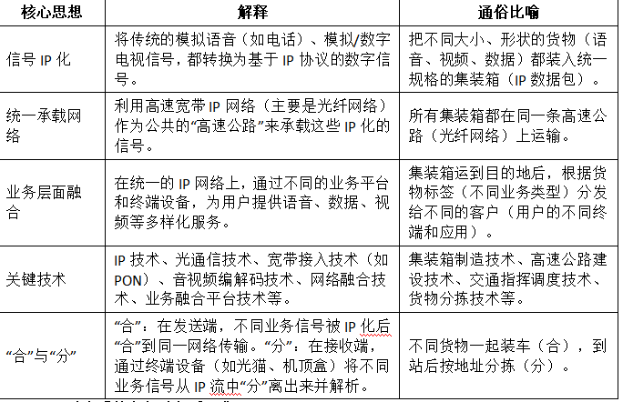 三网融合的核心在于将原本在不同物理网络上传输的语音、数据、视频信号,通过IP化(都封装成IP数据包)和统一的传输协议,在一根物理介质(主要是光纤)上进行传输。