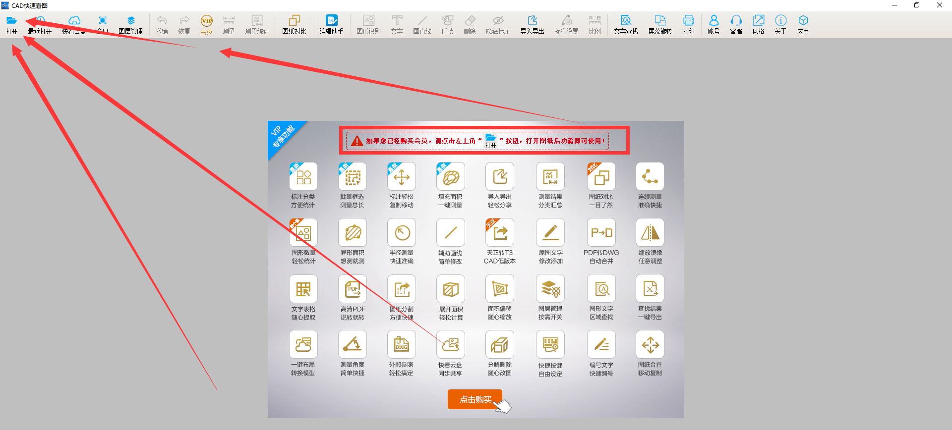不要在开屏时跳出的界面点会员功能哦~那里只是介绍,功能的位置不在那里的,点击左上角的打开按钮,打开图纸使用会员功能即可