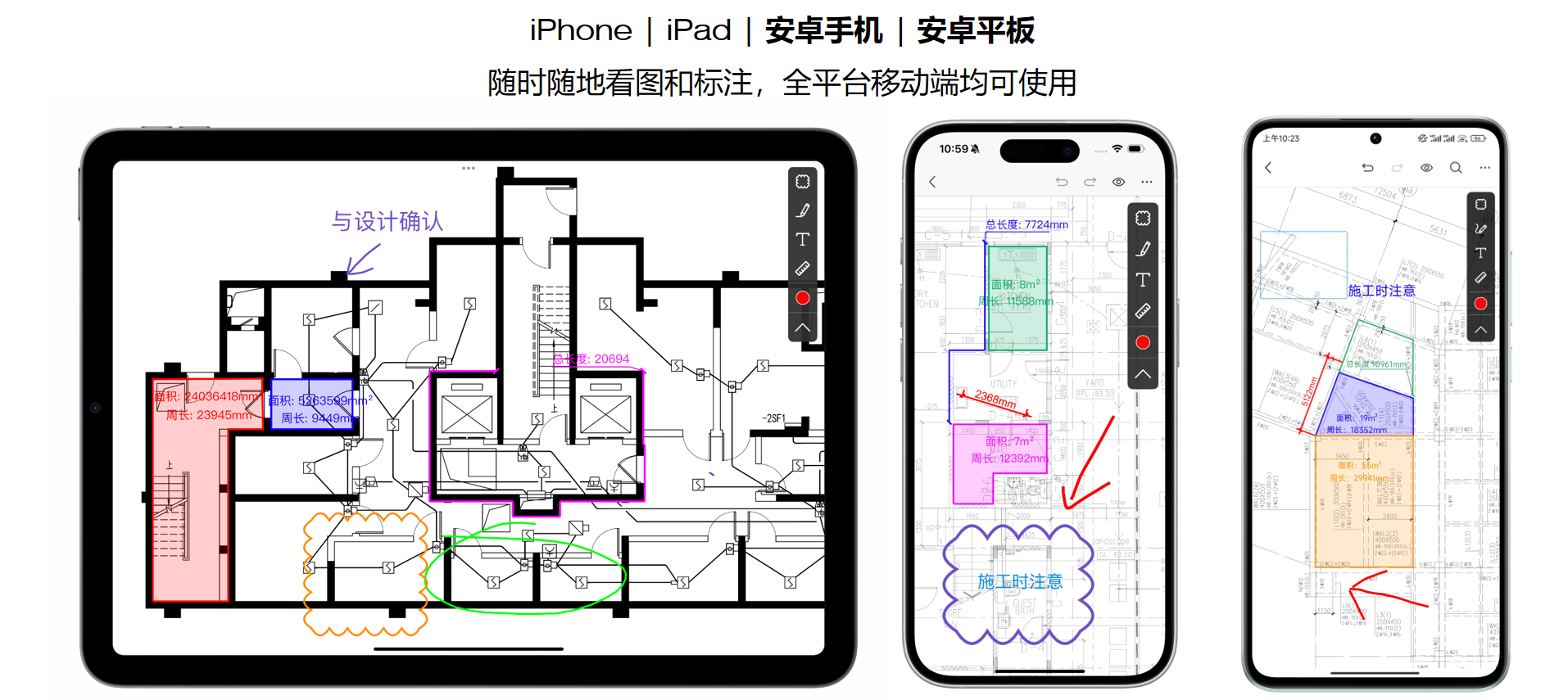 无论你使用的是Windows、Mac电脑,还是iPhone、iPad、安卓手机或平板,都能顺畅使用,随时随地处理图纸。