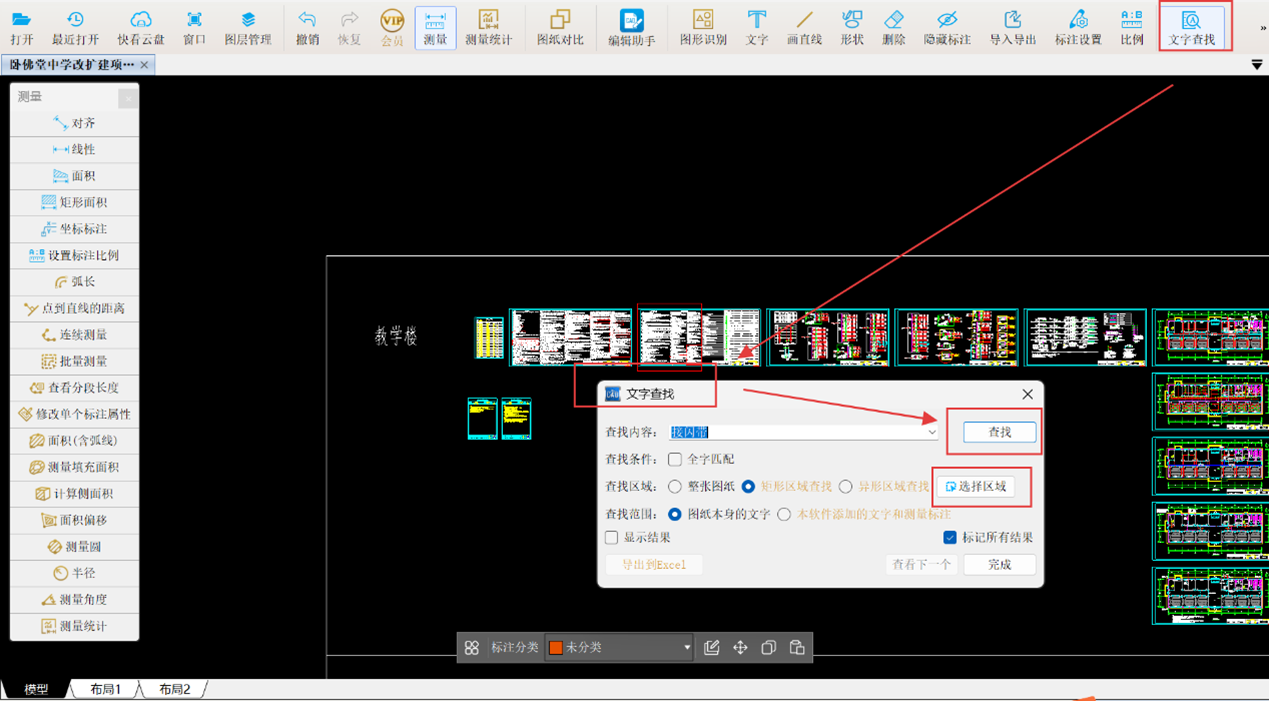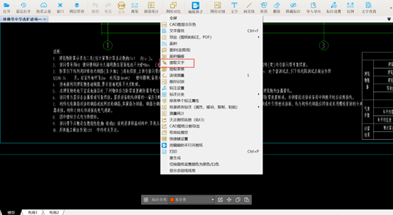 2. 为精确计量,需预先查阅设计说明,在CAD快速看图软件中启用【文字查找】功能,输入关键词并设定查找范围,精准定位相关内容;随后使用【提取文字】功能,将关键说明直接导出至工程量计算表。