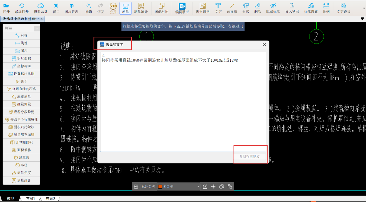 利用CAD快速看图【批量测量】一键框选,可快速计算接闪带水平长度;高效计量工程量,结合【提取文字】和【文字查找】工具,协助快速编制工程量清单。