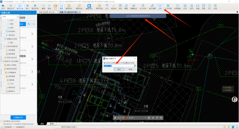 1、小区背景音乐图纸通常在室外弱电图纸中,因此我们计算开始之前,首先要调整下图纸比例,应用功能为比例,选择一段已知长度的起止点,在弹出的对话框中根据已知长度进行设置。