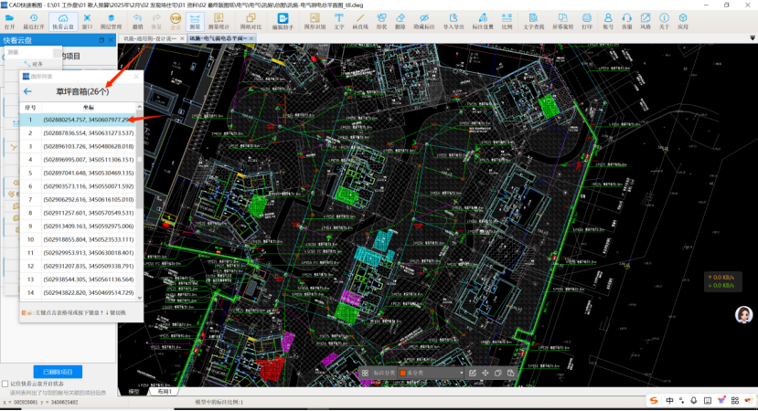 3、点击开始识别,即可得到草坪音箱工程量,双击坐标点可以反查