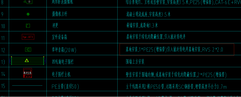 通过图例表信息,我们知道音箱线缆选型,暂定埋深为0.8m