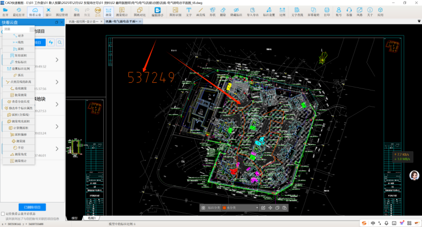 框选图纸,即可得到音箱线缆图示水平工程量537.249m,前面我们暂定了埋深为0.8m,因此室外音箱线工程量为:PE25管:537.249+0.8*26=558.049m;RVS-2*2.0:537.249+0.8*26=558.049m