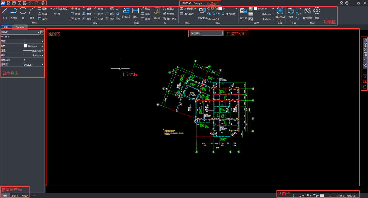 鸿鹄CAD的功能界面交互简单、布局科学,轻量化、国产化的设计风格能够显著降低学习门槛并提高设计效率。如图1-1所示,鸿鹄CAD的操作界面包括标题栏、功能区、快速启动栏、绘图区、属性列表、导航栏、状态栏、模型与布局、十字光标等。