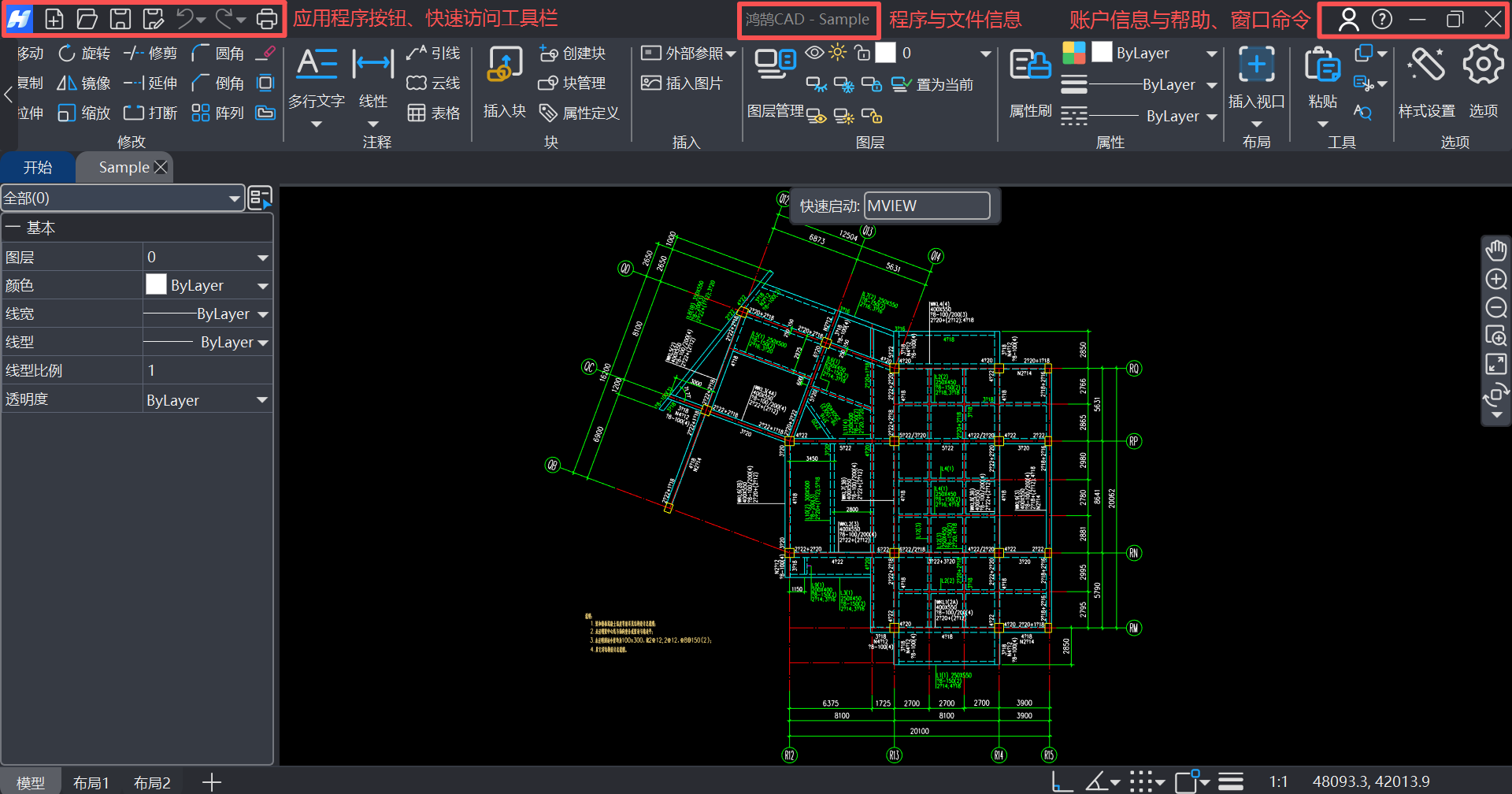 【鸿鹄CAD用户手册】第一章 鸿鹄CAD入门与基础功能 · 1.1 功能界面简介