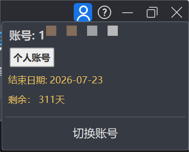 4.点击标题栏最右侧个人头像,可以查看当前登录的个人账户信息,包括个人账户号码和会员结束日期,您可以在本页面切换账号。个人头像按钮右侧是帮助按钮,点击以访问在线帮助文档,并查看当前版本的鸿鹄CAD信息,如图1-7所示。