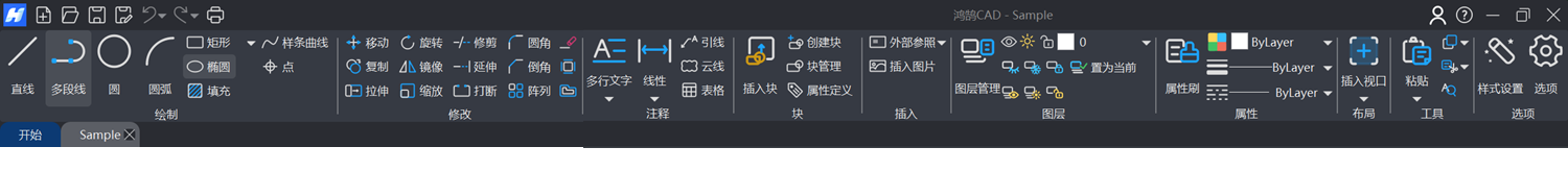 鸿鹄CAD的功能区位于标题栏下方,是进行所有绘图与编辑操作的区域。面板组成由左到右依次为:"绘制"、"修改"、"注释"、"块"、"插入"、"图层"、"属性"、"布局"、"工具"、"选项"。功能区界面如1-8所示。