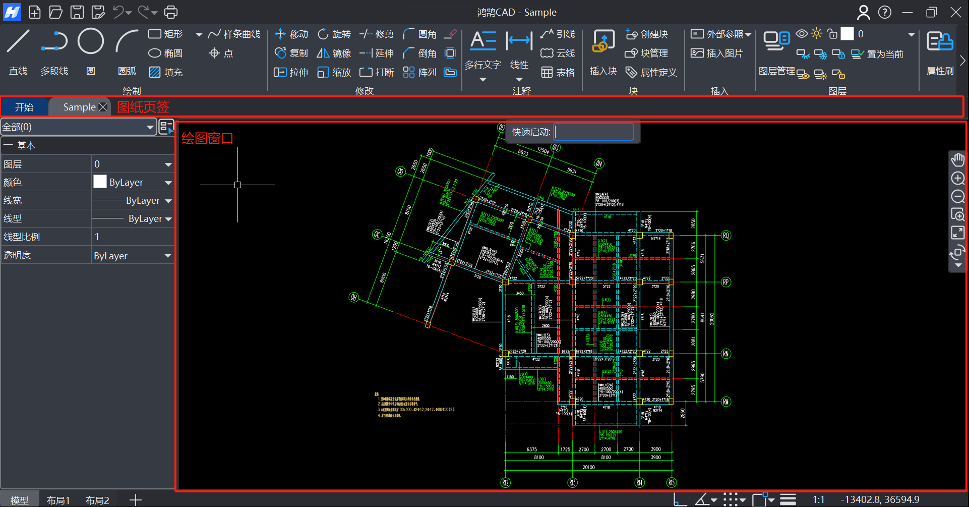 绘图区位于鸿鹄CAD操作界面的中心位置,是进行所有绘制和编辑操作的主要区域。绘图区由"图纸页签栏"和"绘图窗口"组成,界面如图1-10所示。