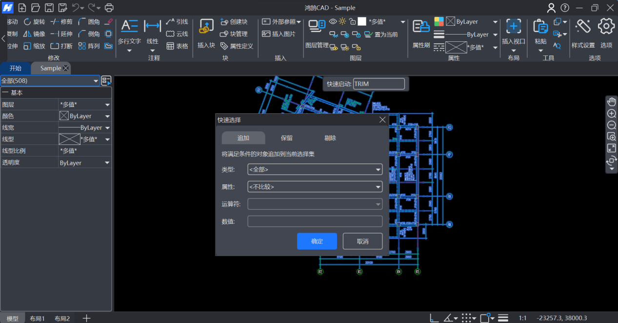 3.单击属性列表右上角的快速选择按钮,可以打开快速选择对话框,根据对象的类型、属性(如"图层"、"颜色")、运算符和值,对当前选中的对象进行追加、保留、剔除的操作,快速过滤出您真正需要操作的对象,如图1-13所示。