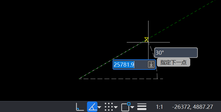 鼠标单击按指定角度限制光标模式按钮,或按键盘快捷键F10开启/关闭,同时可以在右侧小三角形点击展开设定间隔角度。在创建或编辑图形的过程中,若光标的移动路径接近预设的间隔角度(或其倍数),绘图窗口中会显示临时的绿色虚线,同时光标吸附到该路径上,方便绘制具有任意精确角度的直线,如图1-17所示。