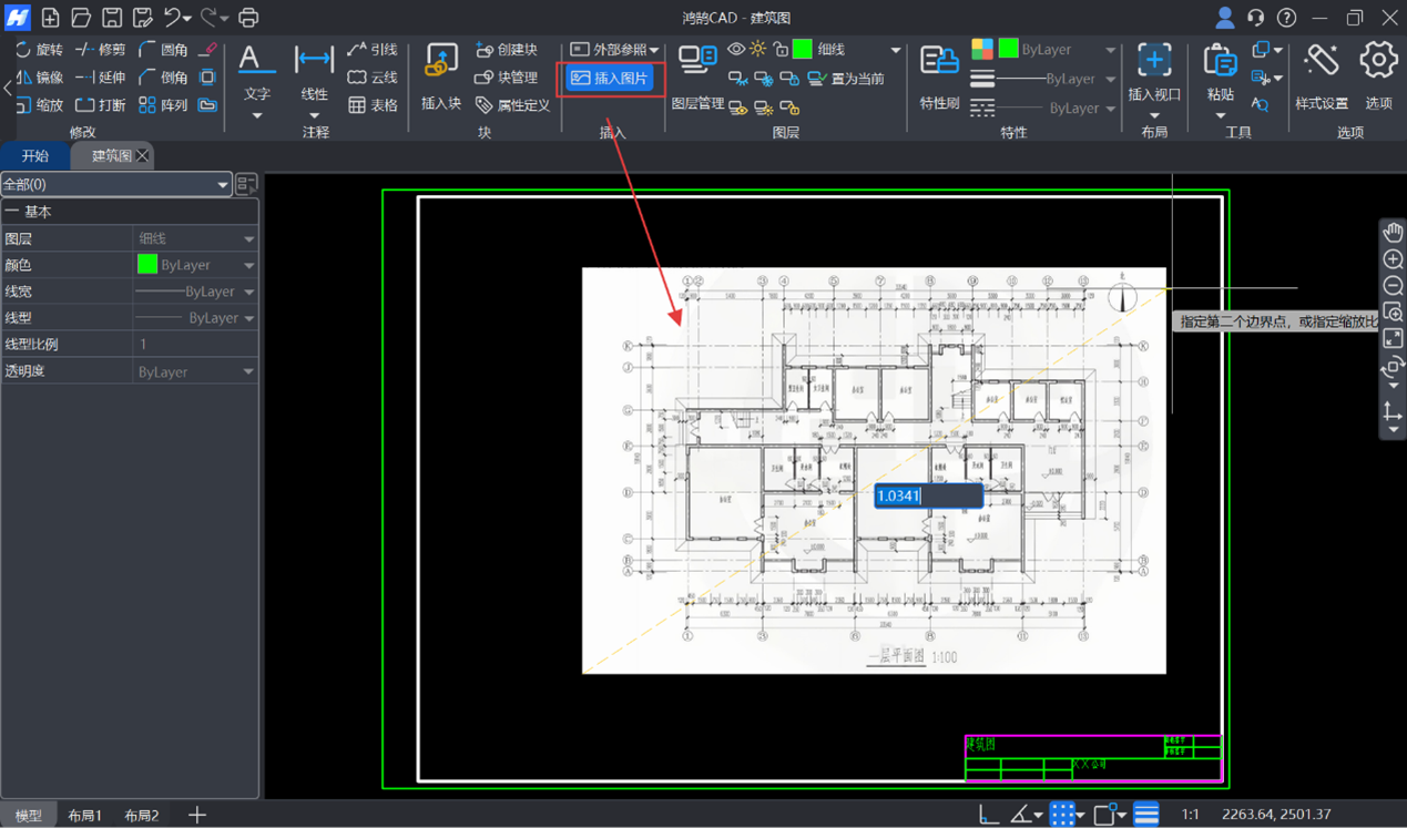 为提升图纸观察效率并减少切屏操作,使用【插入图片】功能将参考图导入鸿鹄CAD。导入后需先确定图片基点,再调整尺寸比例。