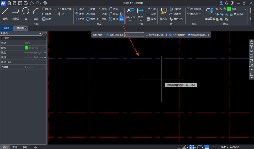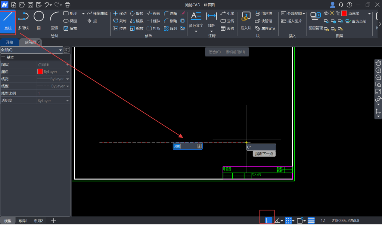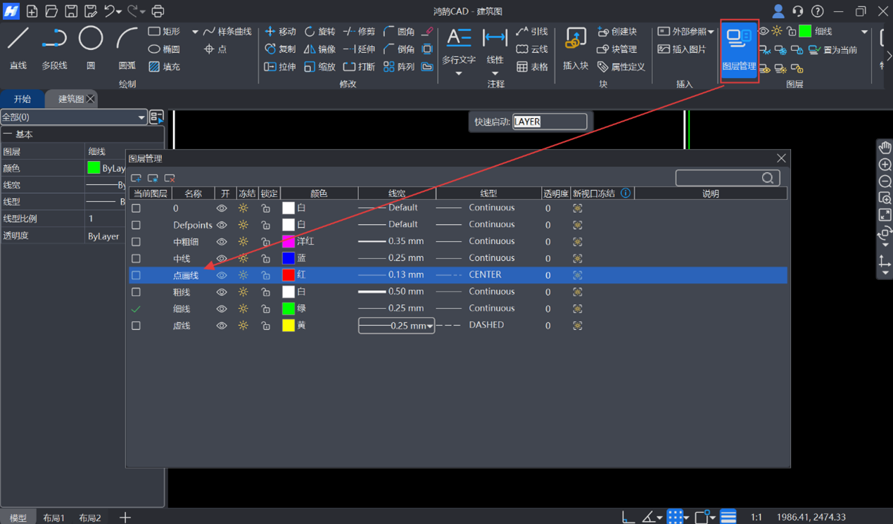 使用【图层管理】功能创建轴线图层,轴线一般采用“红色”“点划线”绘制,把“当前图层”的绿色对钩切换至点划线图层后,使用【L】(直线命令)绘制首条轴线。