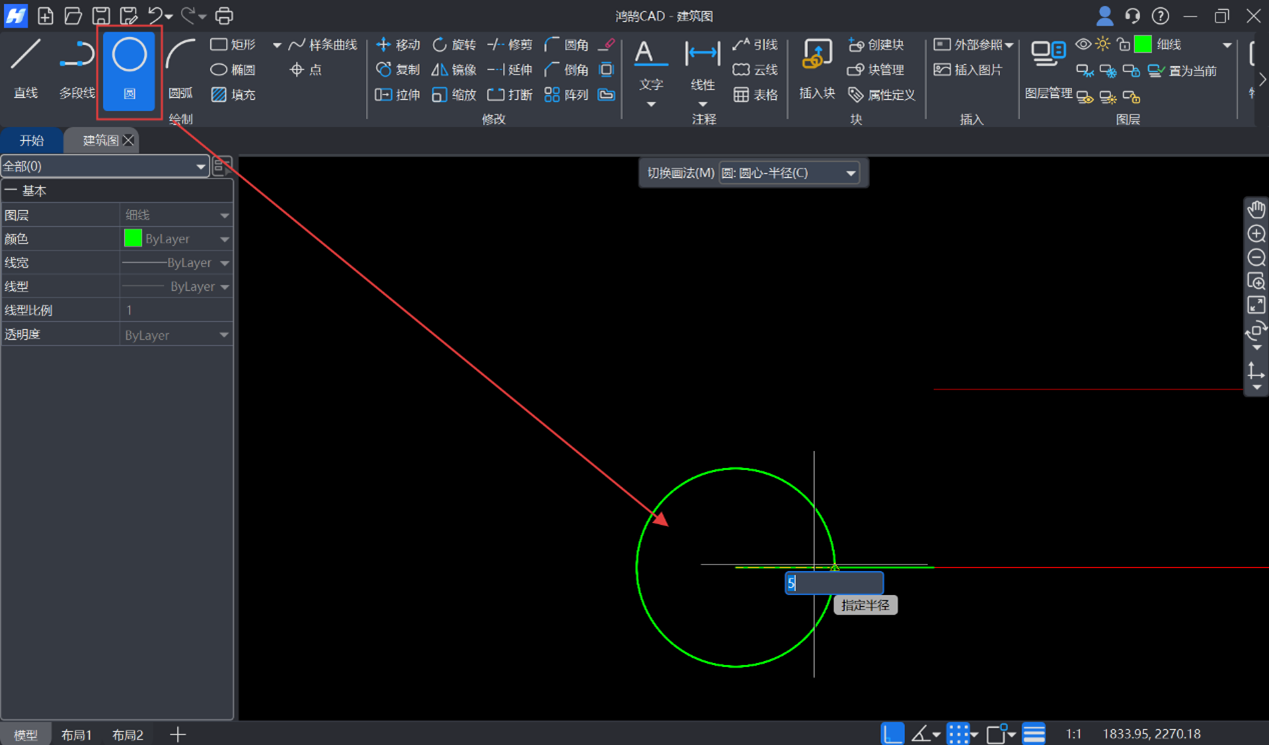轴线编号圆为细实线,直径取8mm(详图为10mm),用【L】(直线命令)在鸿鹄CAD中快速绘制短直线后,输入【C】(圆命令)选择"圆心-半径"模式,指定半径4mm绘制圆,最后使用【TR】(修剪命令)自动修剪多余线段。