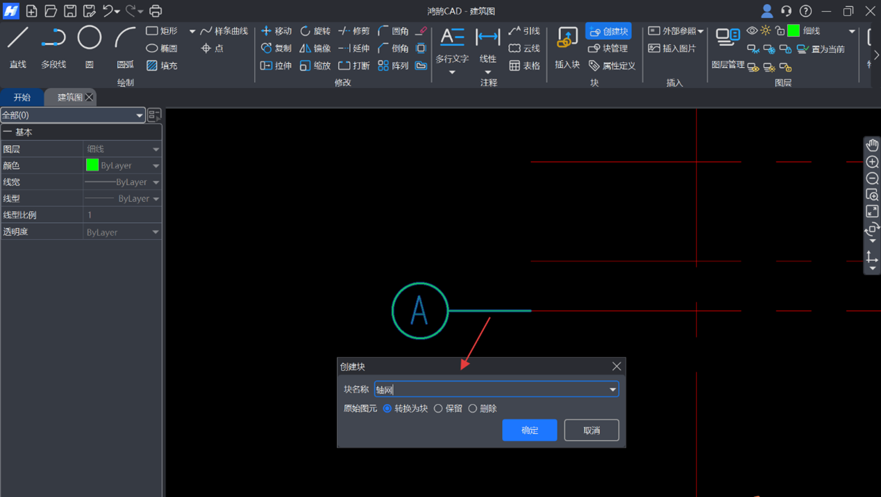 5.框选完整轴号组件,使用鸿鹄CAD的【B】(创建块)命令命名保存成块,便于复用编辑其他轴号,这样可确保复制时组件完整性。