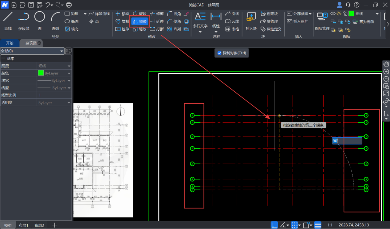 对称轴号:用【MI】(镜像命令)勾选"复制对象"保留原图复制。