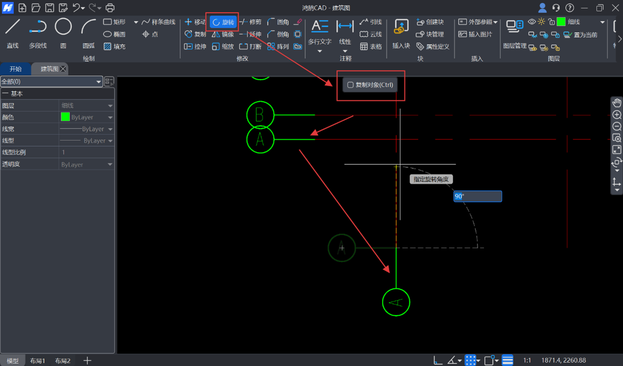 完成开间轴号复制后使用【RO】(旋转命令):选择一个轴号图形→指定基点→输入角度90°→空格确认,将开间轴号旋转复制至进深方向。