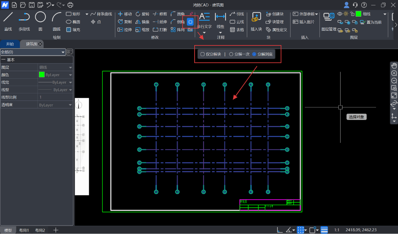 鸿鹄CAD的分解功能支持"一键打散到底",很适合多层组块的图形,无需重复操作即可一键彻底打散成独立线段。
