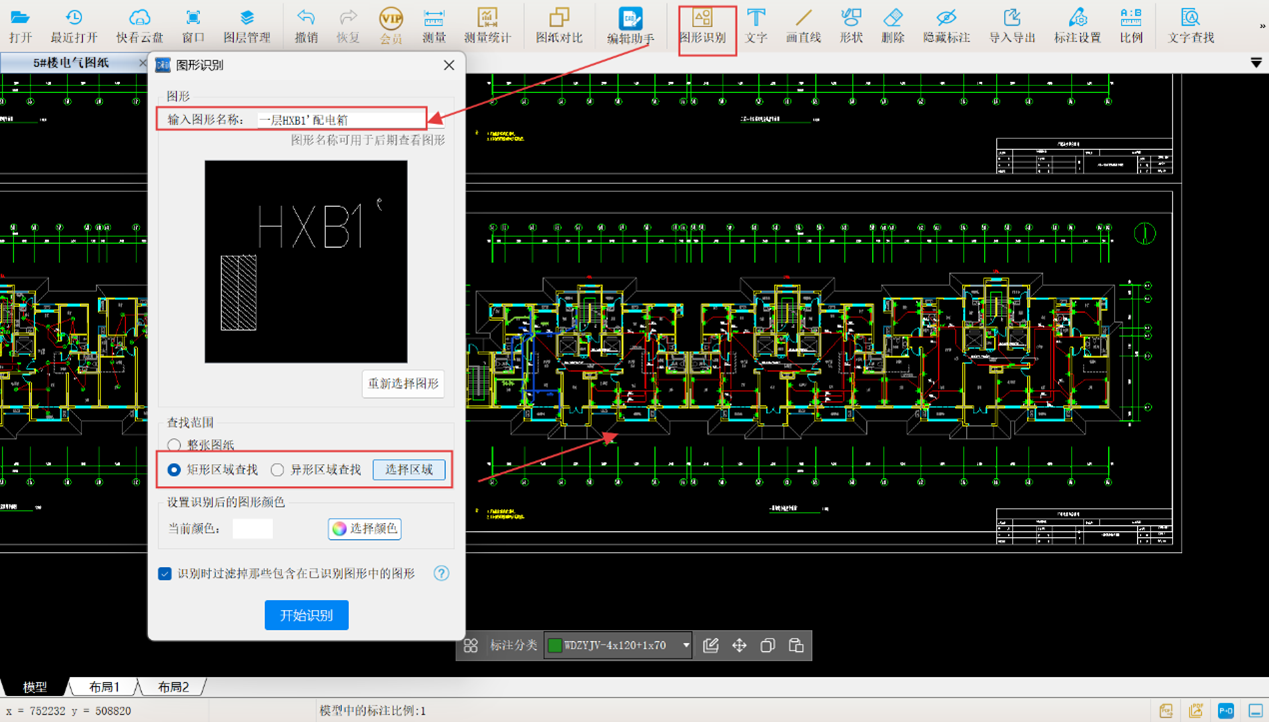 在CAD快速看图中,点击工具栏的【图形识别】功能按钮。框选配电箱HXB1的图例,完成选择后在绘图区任意空白处点击鼠标右键确认。随后在弹出的对话框中输入该图形的具体名称(如"一层HXB1配电箱"),此步骤便于后续检索。接着设置识别范围,框选整张一层电气平面图后,即可启动自动识别统计。
