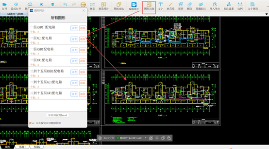 3. 完成所有配电箱识别后,通过【查看已识别图形列表】核查工程量。为方便分类计算,可将列表导入Excel处理。统计结果显示:配电箱HXB1共计66台,AW1与AL1各33台。