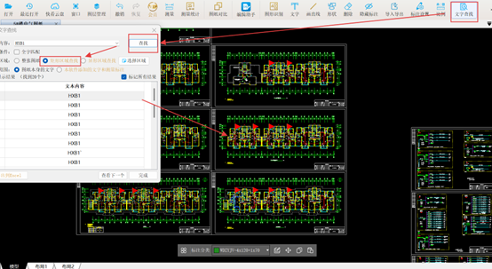 4. 为确保工程量准确性,可启用【文字查找】功能:以"HXB1"为关键词框选平面图范围,识别后每个关键词旁将出现小红旗标记,通过“数个数”进行复核验证。