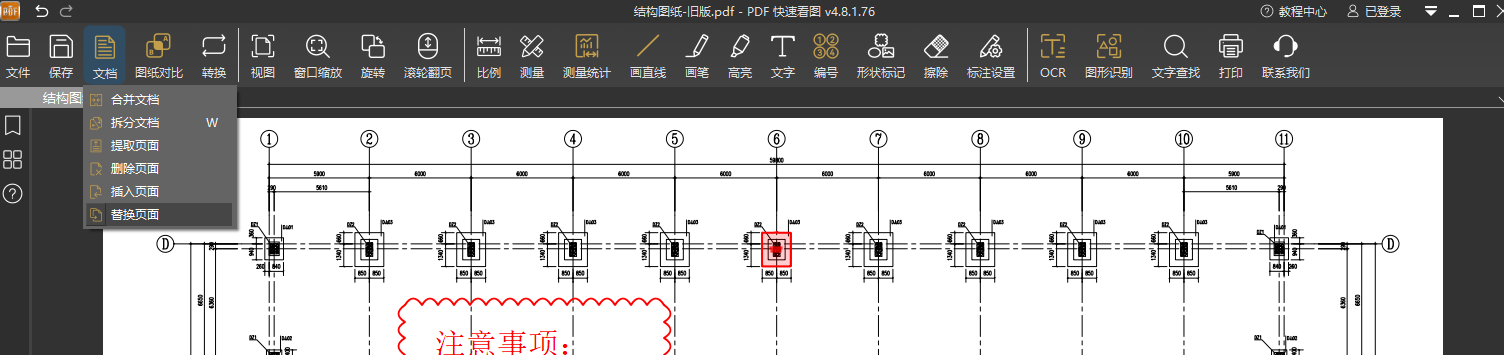 打开旧版PDF图纸(被替换的图纸),点击【文档】按钮,会出现一个下拉菜单,点击【替换页面】按钮。