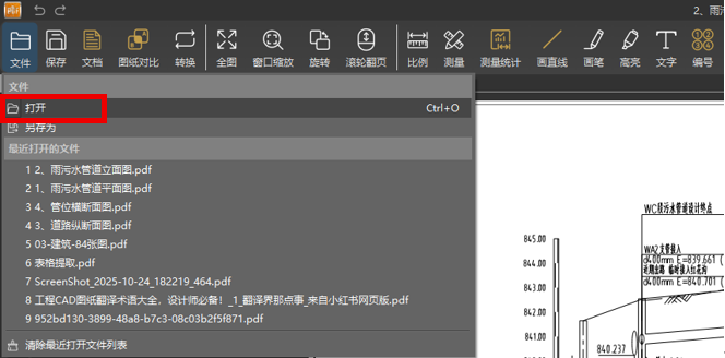 运行「PDF快速看图」软件,点击左上角【文件】按钮,打开您需要转换的PDF图纸。