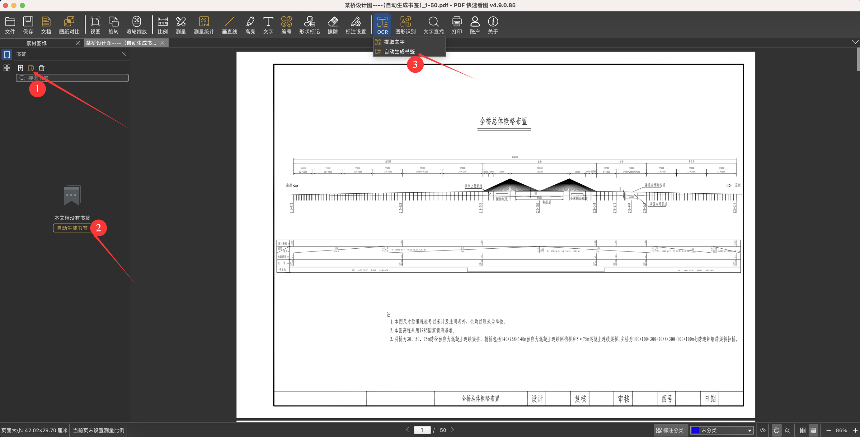 3、点击“自动生成书签”功能,“自动生成书签”功能有3个入口:①书签栏上方;②书签栏中间(仅没有书签时);③OCR功能下