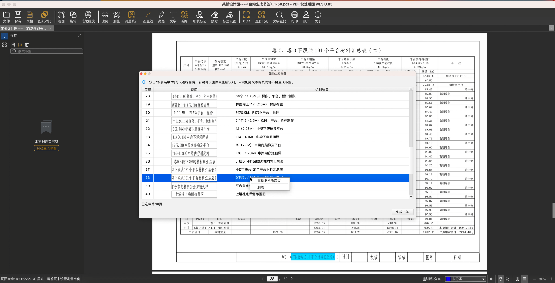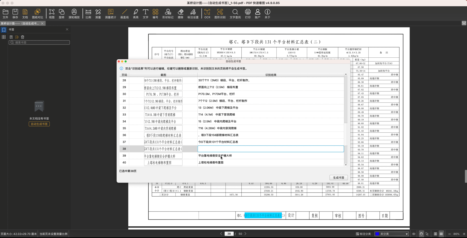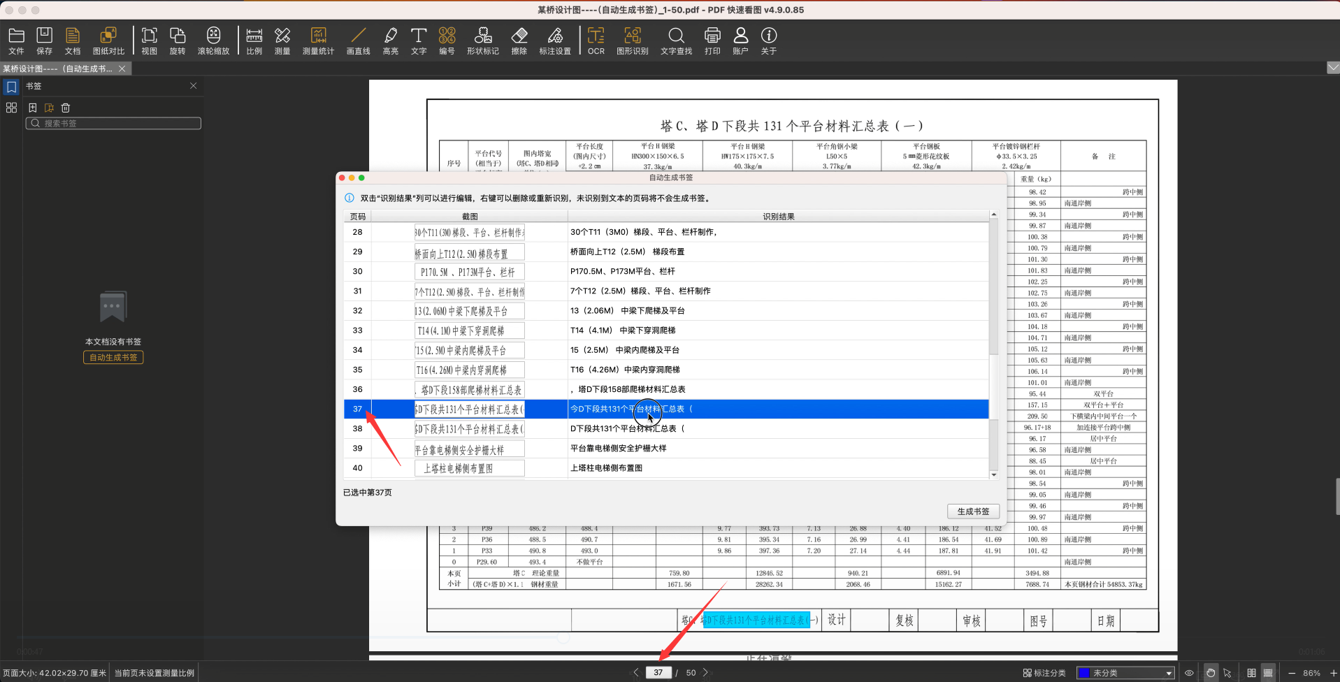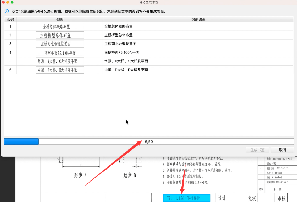 6、识别结束后,在“自动生成书签”窗口可以查看到全部的识别结果,点击识别结果可以定位到该页,查看原始图纸内容