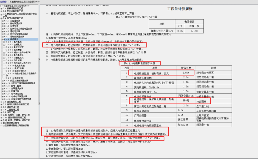 2、电缆计算包含垂直长度+水平长度+附加长度(按表4.8.6取值),本工程涉及到的附加长度有电缆松弛度系数2.5%,电缆进配电箱半周长,电缆头16平方毫米以下计算接线端子,所以电缆终端头不加1.5m。