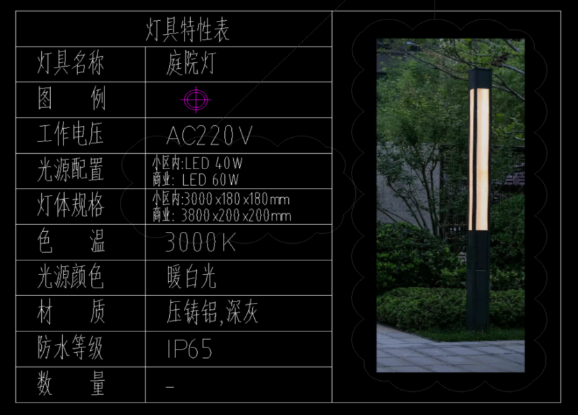 可以看到灯具的规格参数,小区内规格3000*180*180mm,材质压铸铝,含地脚螺栓。