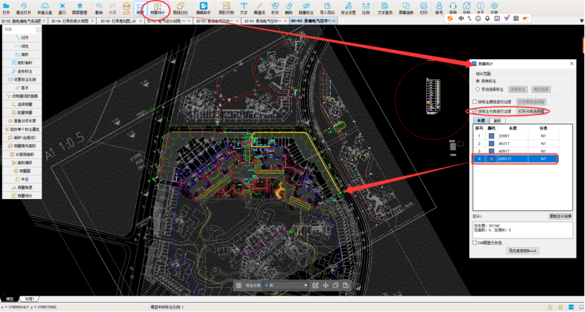 4、利用软件连续测量功能,量出平面长度,查看测量统计得出回路平面工程量200.117m。