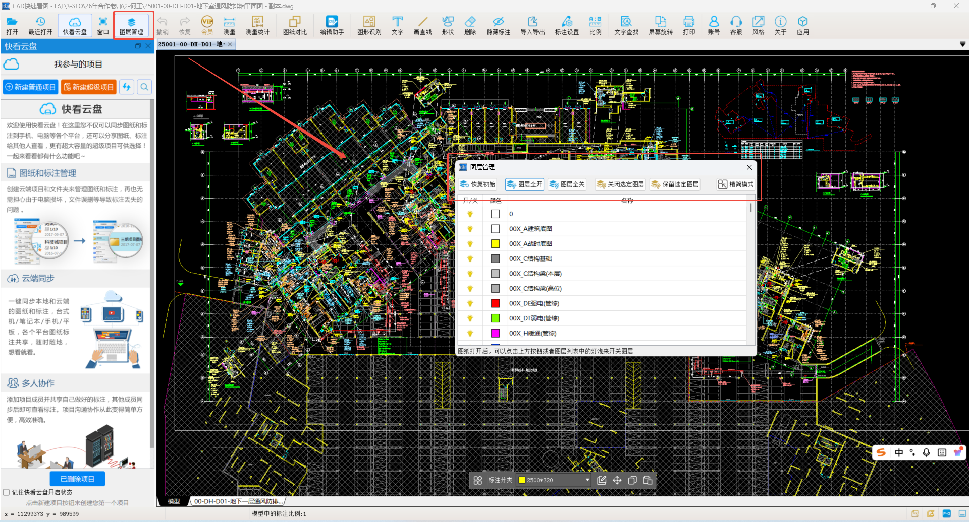 点击CAD快速看图上方工具栏“图层管理”→“保留选定图层”,保留“风管”“风管管件”相关图层。