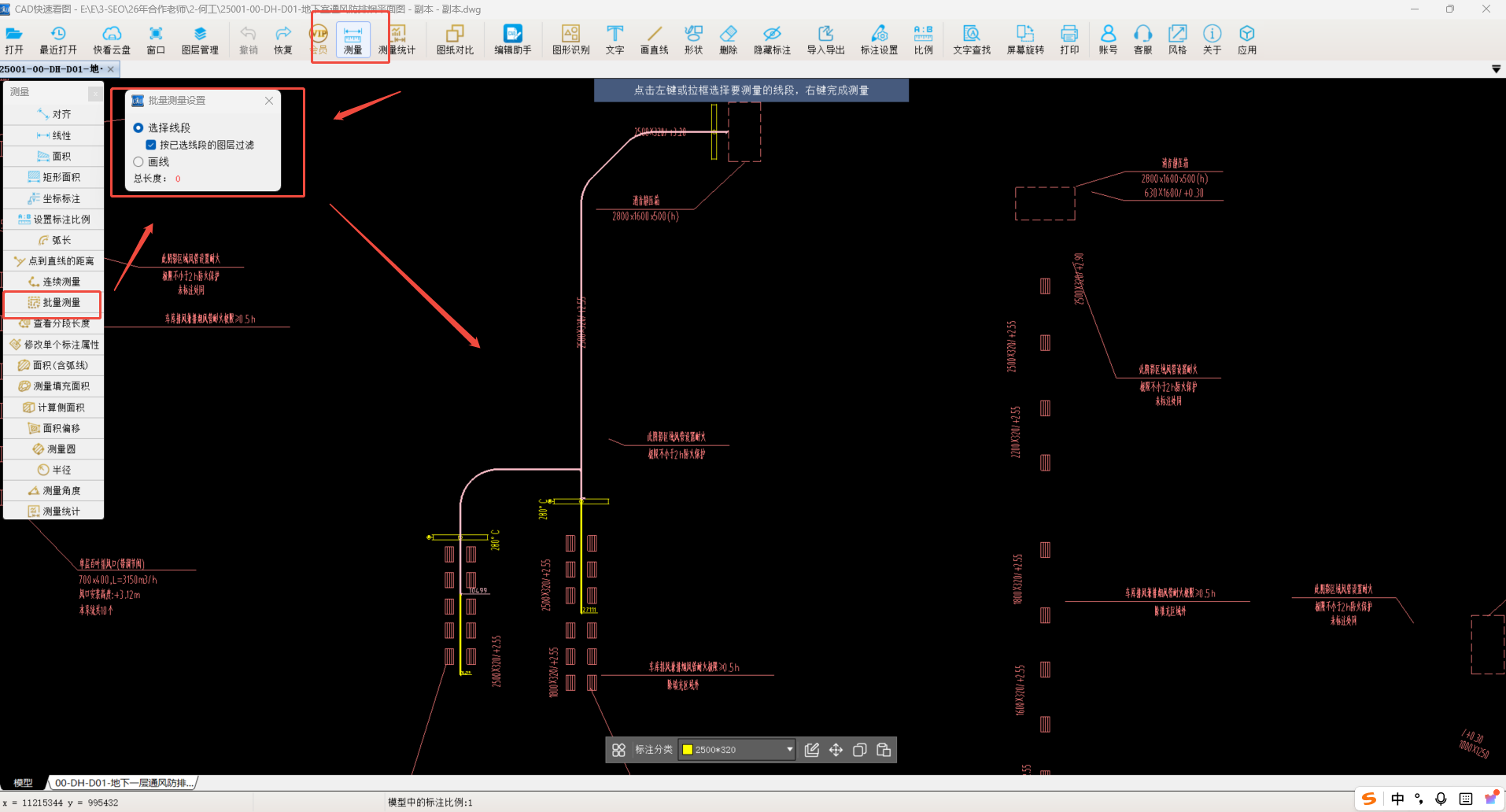 点击软件上方工具栏“测量”→“批量测量”,勾选“按已选线段的图层过滤”,框选同一规格、同一材质的风管线段(选中后线段高亮显示),软件实时显示总长度,右键确定即可完成该规格风管长度统计;若存在弧形风管,切换至“弧长测量”功能,点选弧形风管边线,即可获取弧长数据。对于断开的风管线段/变径处中心点,可使用“批量测量”中的“画线”功能补画连通线段,确保测量长度准确。