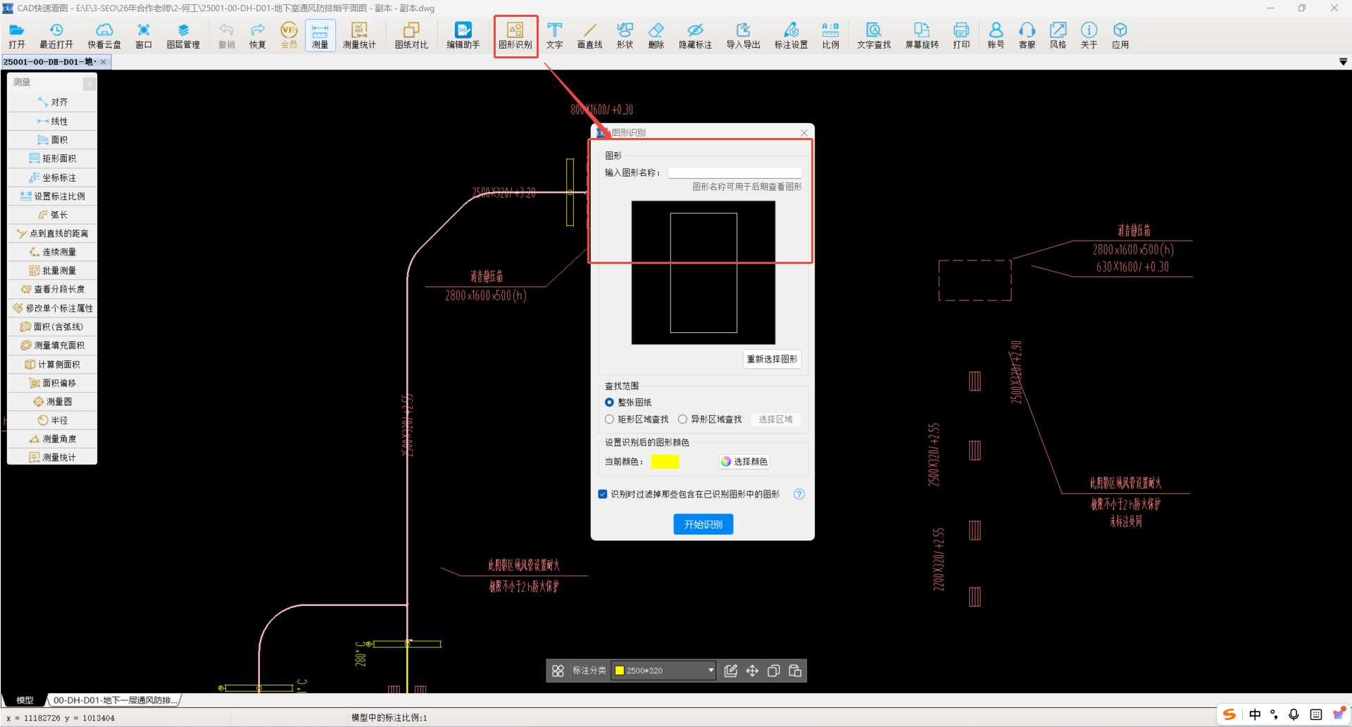点击软件上方工具栏“图形识别”功能,框选目标风阀(或风口)图例,右键弹出对话框,输入构件名称(如“280℃防火阀”),限定搜索范围矩形区域/异形区域,启动识别;识别完成后,通过“查看已识别图形列表”功能,统计不同规格、类型的风阀、风口数量,可直接导出统计表导入Excel。