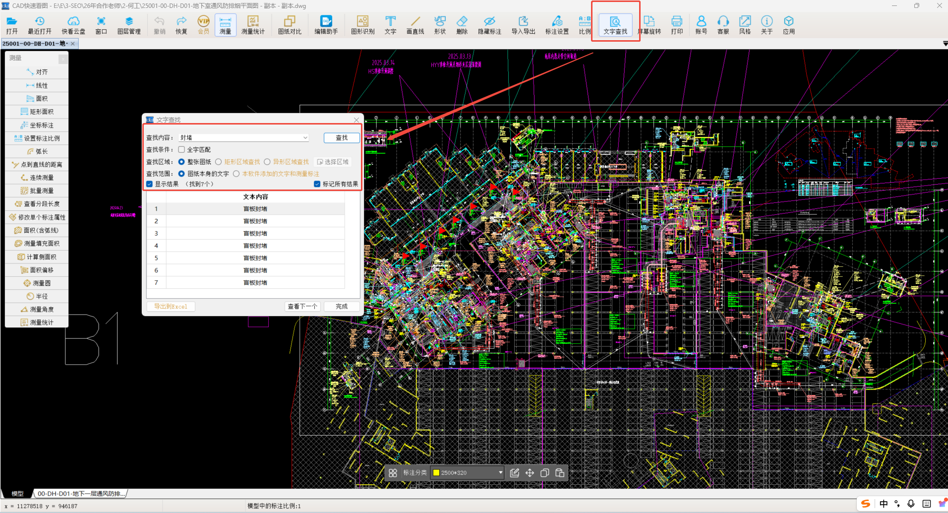 1、防火封堵(容易漏项):按设计图示尺寸以“处”或“㎡”为单位计算,穿墙、穿楼板封堵按图示数量以“处”计算,大面积封堵按展开面积以“㎡”计算,“文字查找”→输入“查找内容”,完成区域内搜索。本工程共7处。